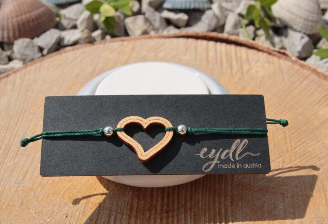 Federleichtes, zierliches Armband mit Herz aus Ahornholz. Das Armband schmiegt sich wunderbar um das Handgelenk. Das Armband lässt sich ganz einfach durch die Verschlussperle in der Größe verstellen.
