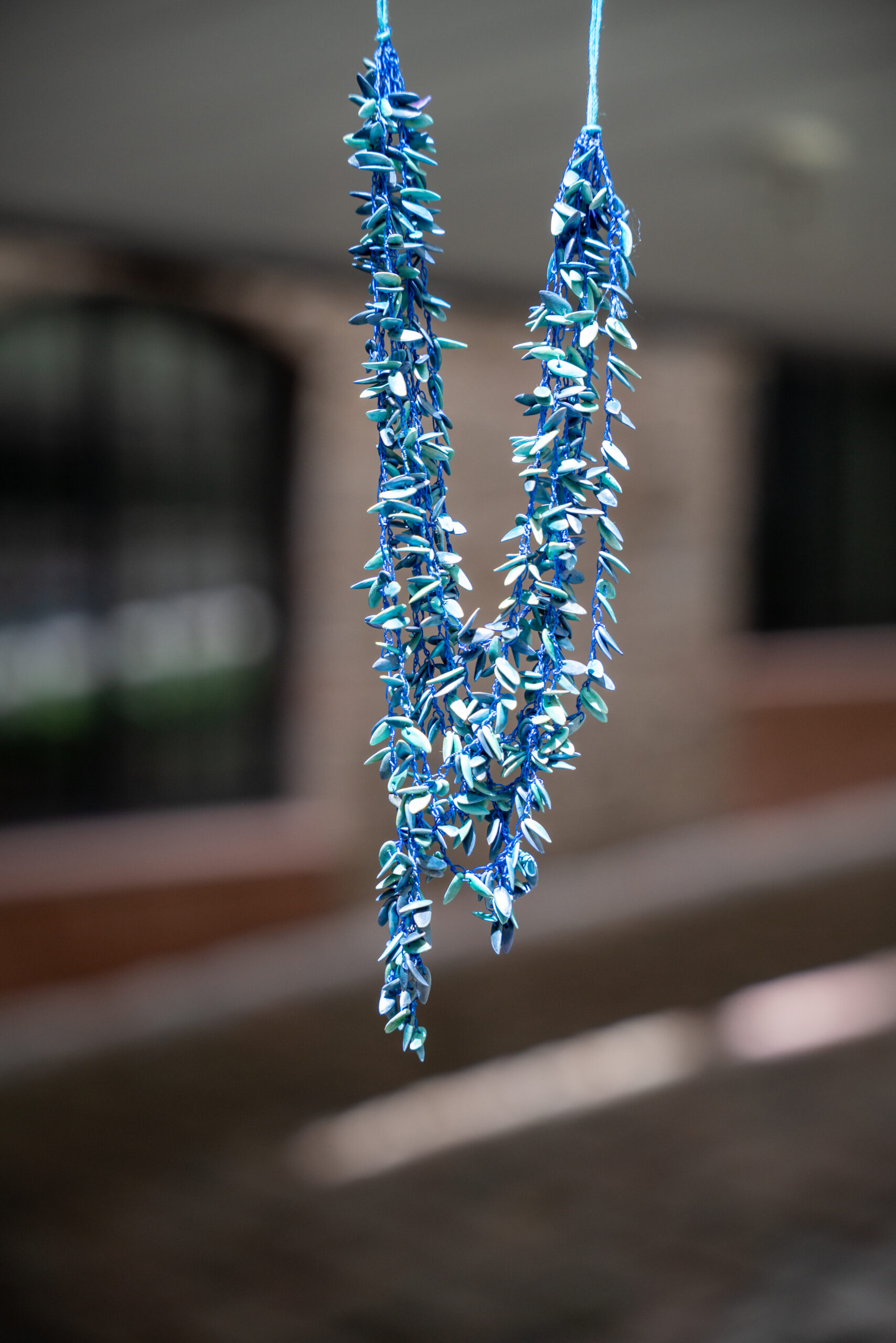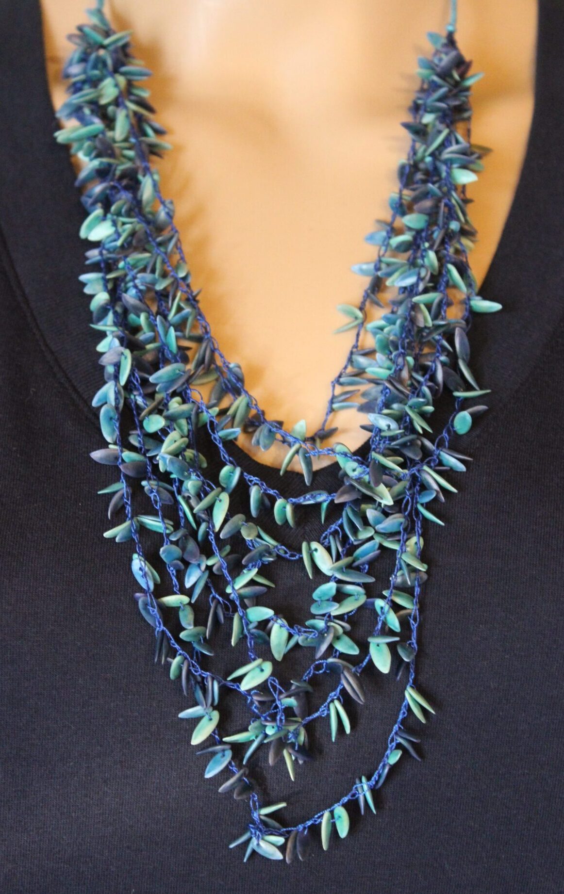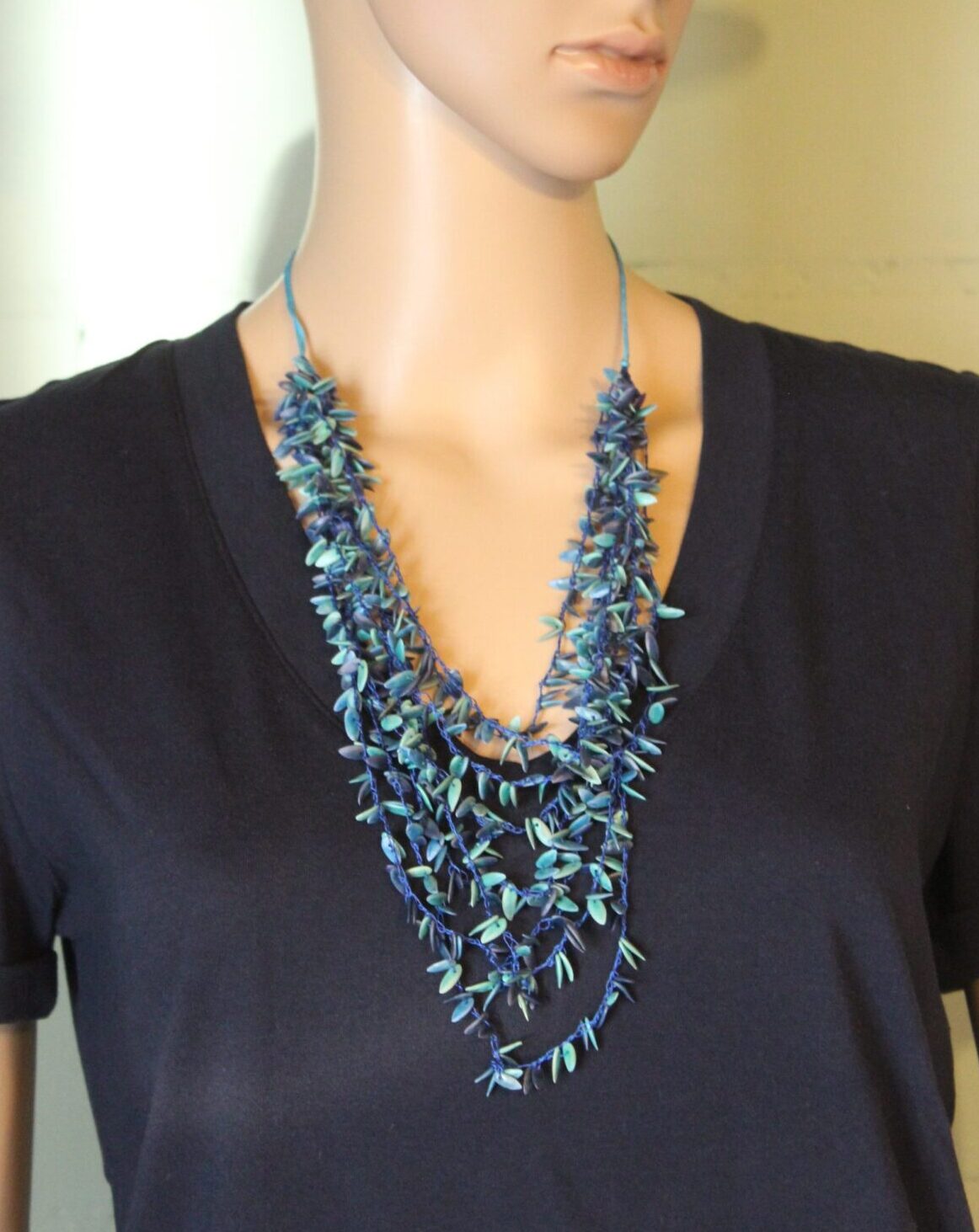 Kette aus Melonenkernen blau – in der Länge verstellbar. Die Kette ist federleicht und angenehm zu tragen